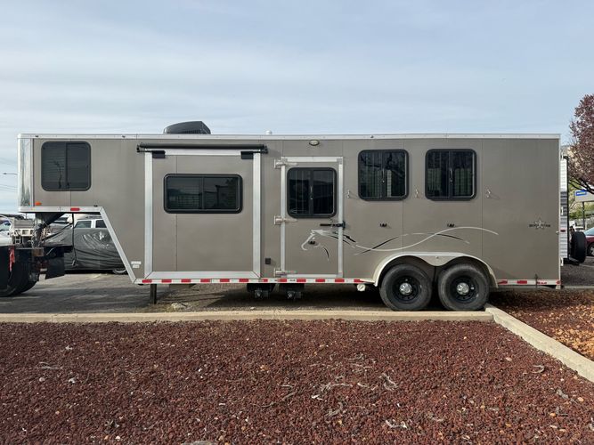 The 2024 Harmar Dixie Outlaw 7307GLQ is a well-balanced horse trailer that combines safe, comfortable transport for your horses with the convenience of built-in living quarters for your travels. Designed with a durable aluminum/steel construction and a smooth-towing dual-axle setup, it’s ready for long hauls, rodeos, or weekend getaways.