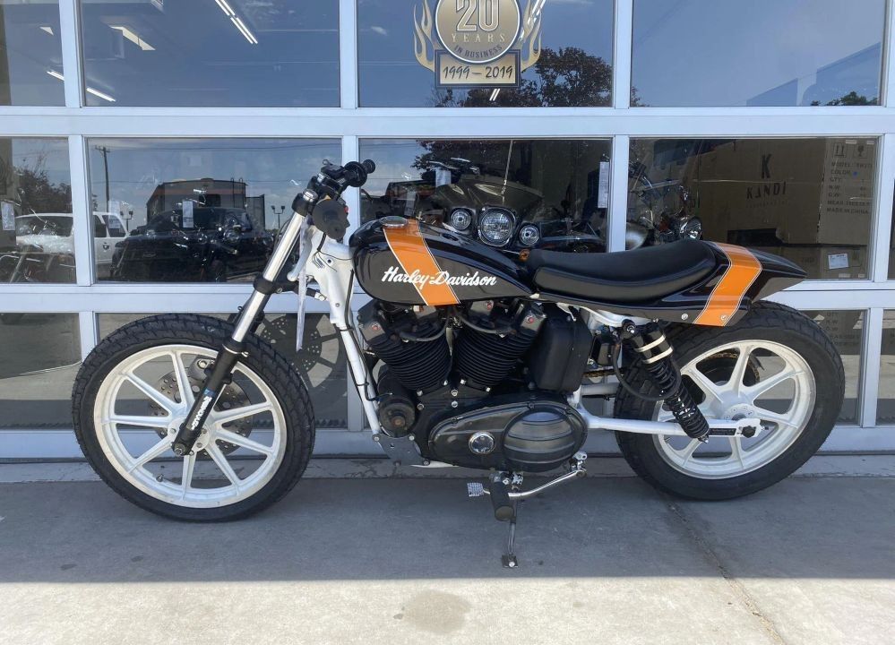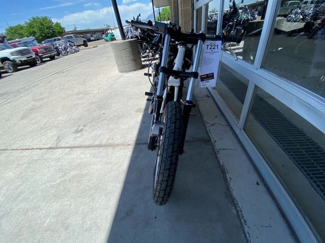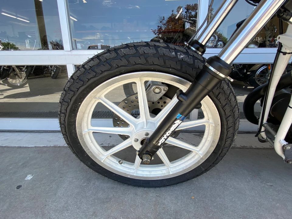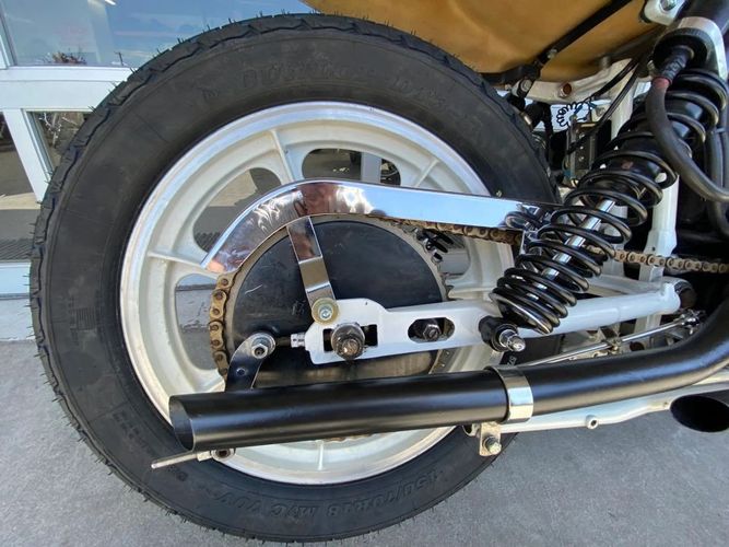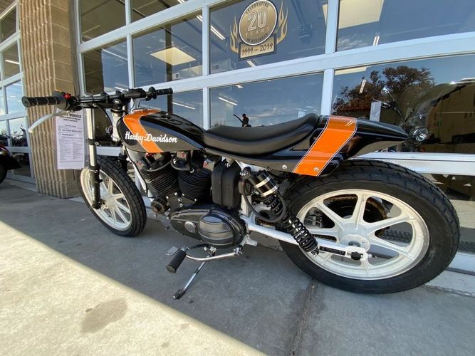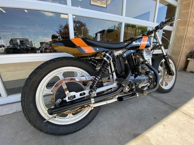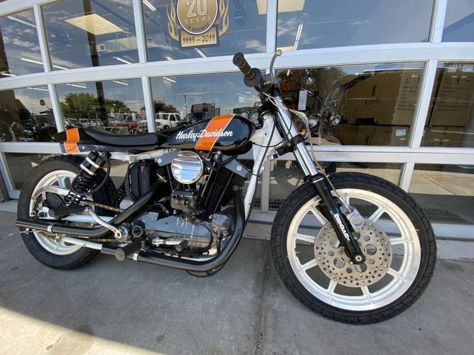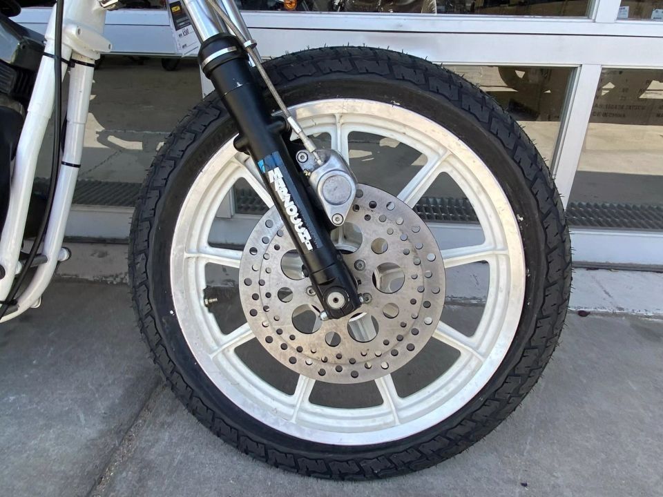 This Sportster Iron Head comes equipped with a 900cc engine with what appears to be a big bore kit with custom push rods but we are unsure what size, 4-speed transmission, carburetor, kick start, Morris Magneto, aftermarket fiber glass tins with custom paint scheme, custom painted white frame, custom painted white mag wheels, disc front brake, rear sprocket chain drive with drum brakes, aftermarket updated rear shocks, 35mm front end, mid controls, NEW tracker tires, extended swing arm, drag bars, and more! Come in and check out today!
