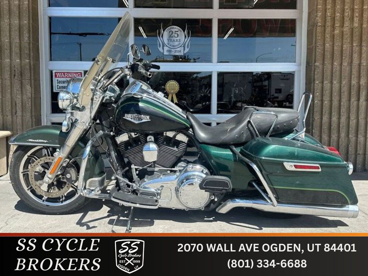 16,614 miles! This Road King comes equipped with a 103ci engine, 6-speed transmission, fuel injection, air cooled, belt driven, disc brakes, dual front calipers, ABS, aftermarket dual chrome Vance & Hines pipes, aftermarket Screamin’ Eagle air intake, two tone black and green paint scheme, black and machined mag wheels, black two up studded seat, hard paint matched saddle bags with chrome saddle guards, quick attach sissy bar, passenger floor boards, rider floor boards, chrome engine guard, windshield, cruise control, spot lights, tank mounted speedometer, and more! Come in and check it out today!