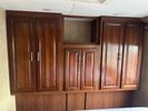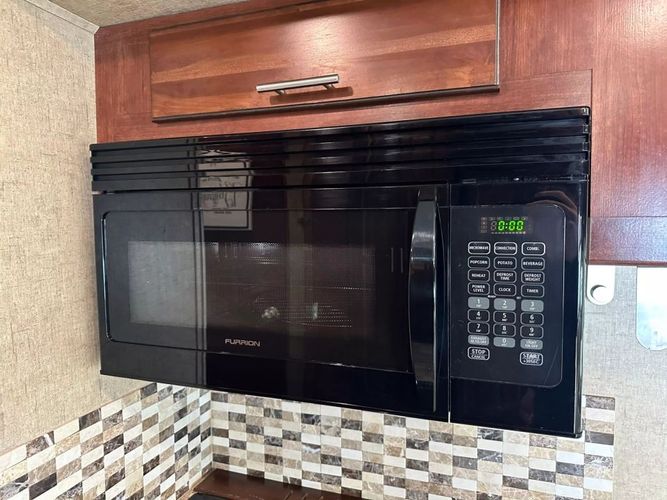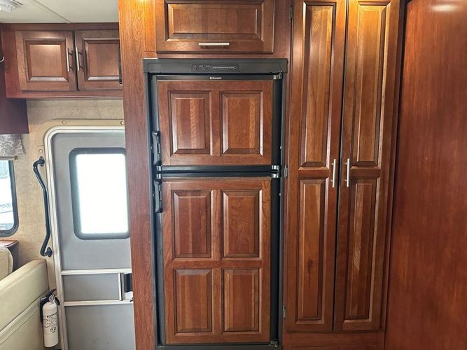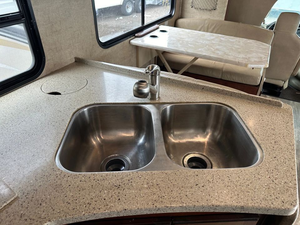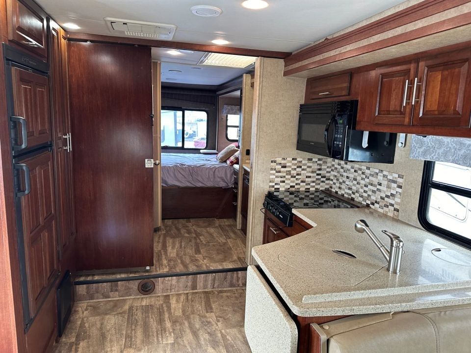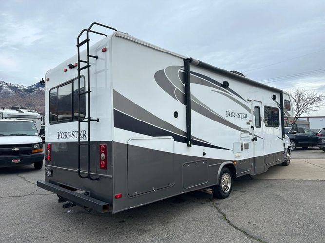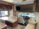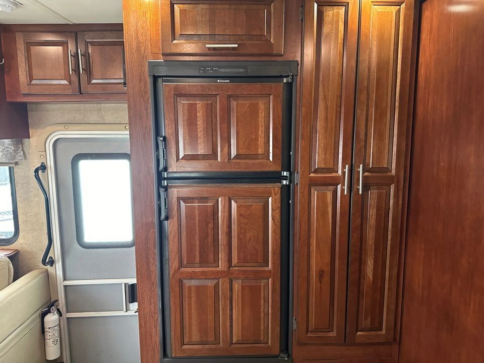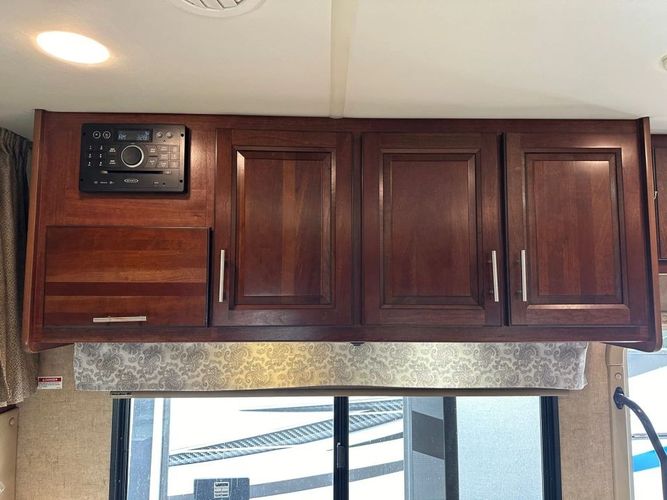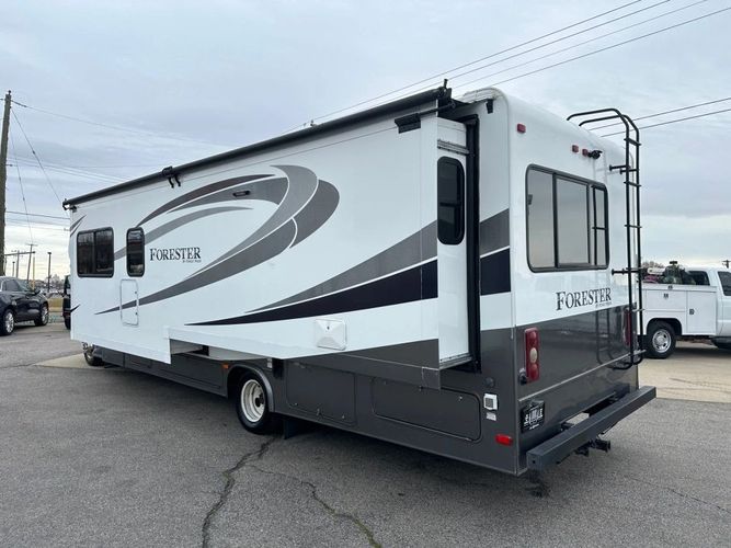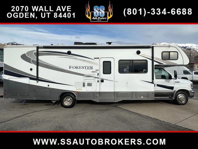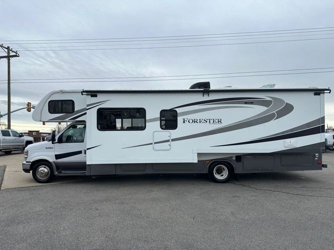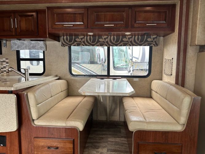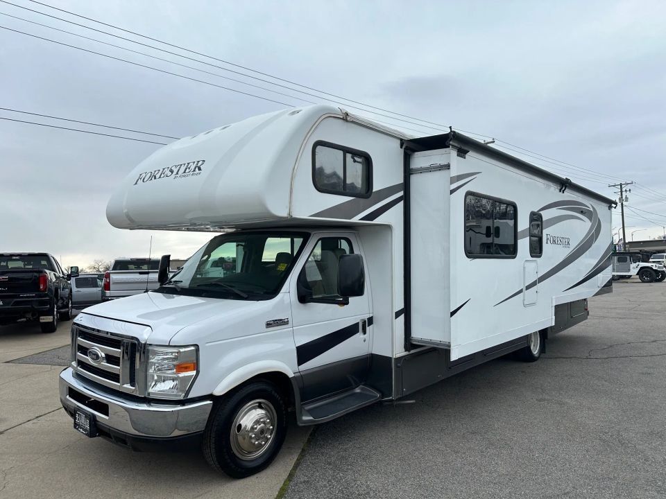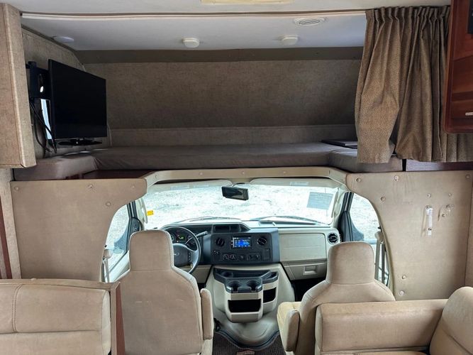 This 32ft Class C motorhome comes equipped on a Ford E450 chassis, equipped with a V10 engine, automatic transmission, 4x2 driveline, tow package, tow/haul mode, cruise control, cabin AC/heat, suede brown captain and co captain chairs, power locks, power windows, power mirrors, back up camera, one large power slide out with awning, power awning, one man entry door, on-board Cummins Onan 4000 with 441 hours, Big Foot auto level system, front over hand bed, swivel mounted flat screen TV, dinette with bed capabilities, futon coach with bed capabilities, full kitchen with stove top/sink/microwave/fridge/freezer, rear hall way bathroom sink, separated toilet and shower, rear master bed room with closet space, Dometic AC/heat climate control, and more! Come in and check it out today!