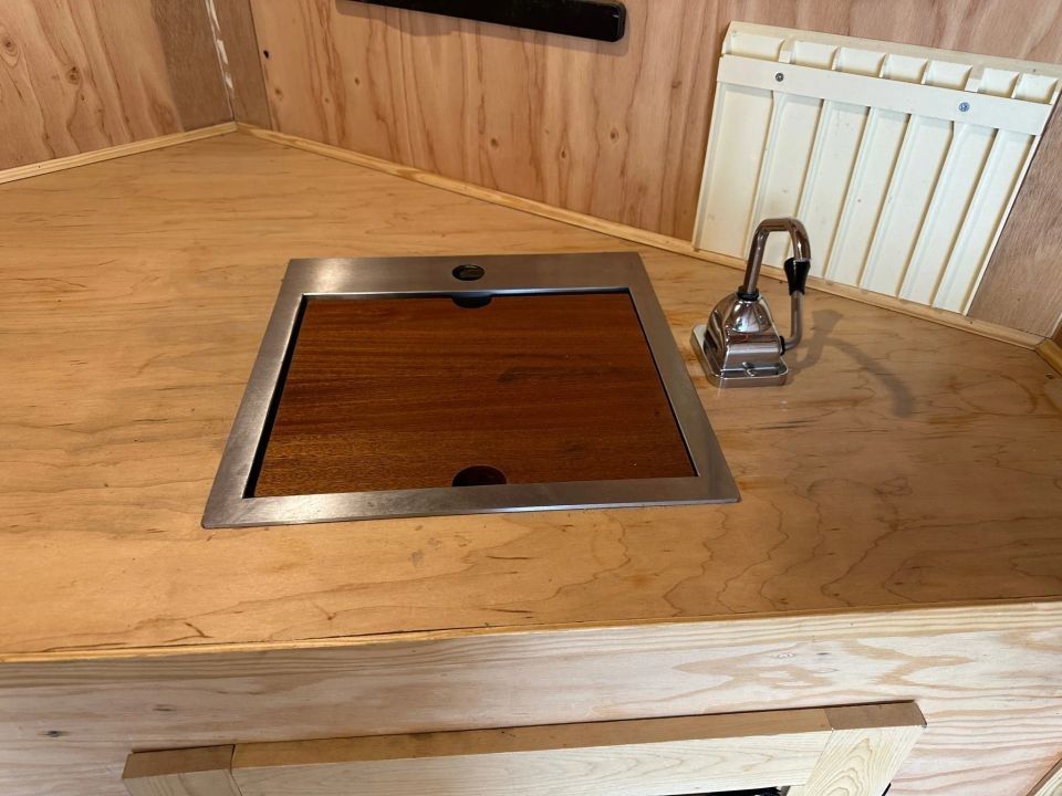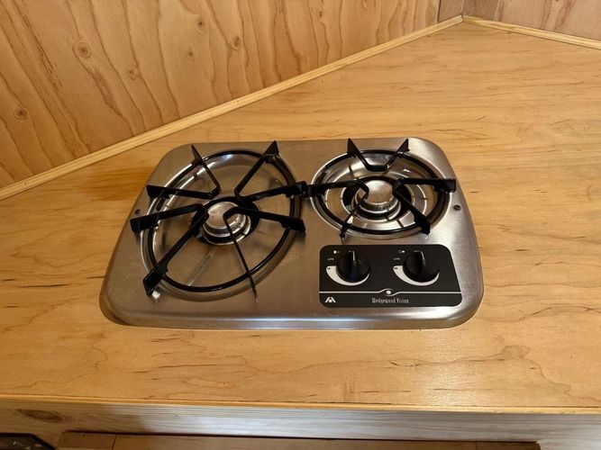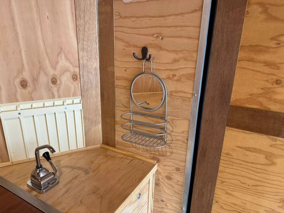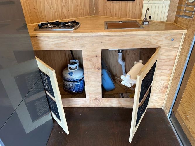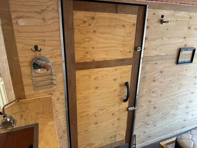 This 12ft enclosed is a camper converted cargo trailer that duals as a camper and a toy hauler, coming equipped with a single axle, rear loading ramp door, one man entry door, wood floors, tie down rings, spare tire mount underneath, custom front counter with stove top, sink, hand pump water pump, 2 10gallon fresh water tanks, fold down master bed, cabinet, LED lighting, (2) 200wt hr batteries to power everything in the trailer, 110v plug in, Xantrex inverter, Belaire 2800 AC/heating unit powered by the batteries, and more! Come in and check it out today!
