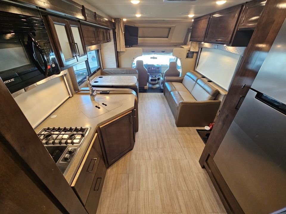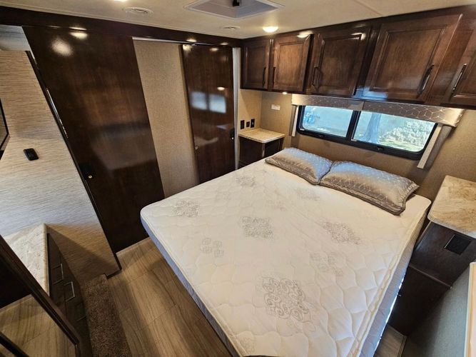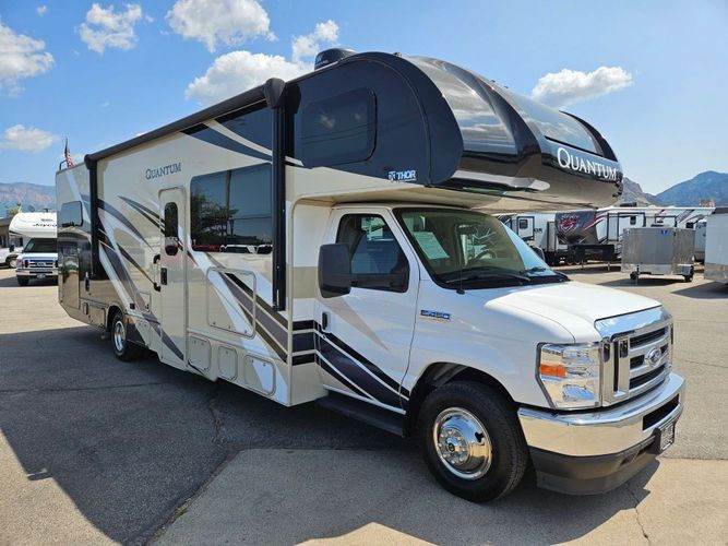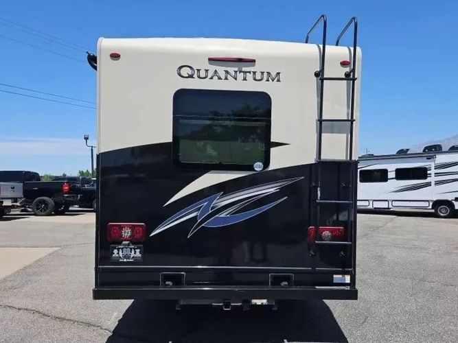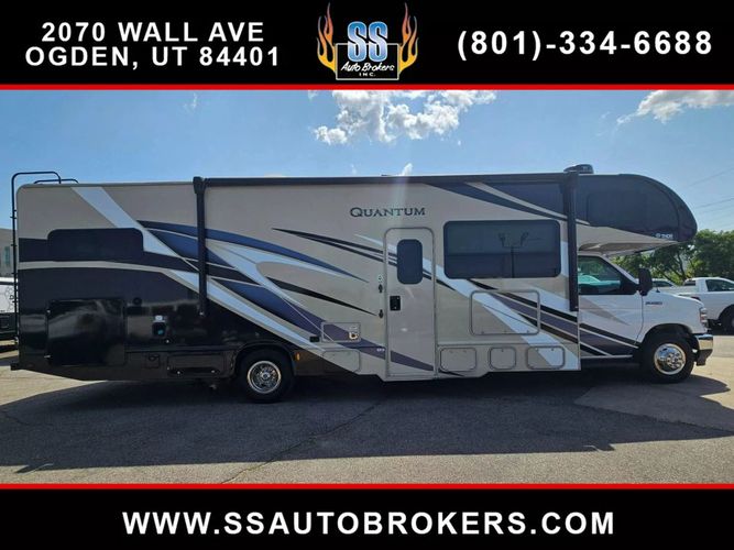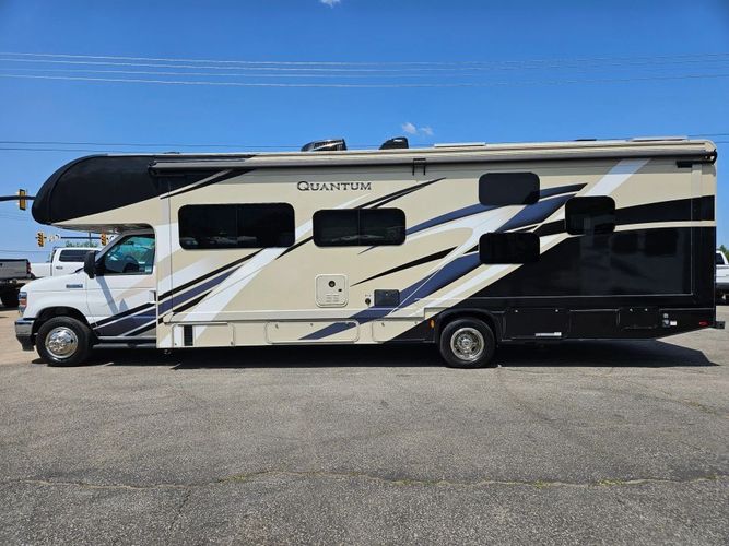 This 32ft 7in Class C Quantum comes equipped on a Ford E450 chassis with a Ford V8 7.3L Triton engine with 25,791 miles, 4x2 drive line, automatic transmission, tow package with tow haul mode, cruise control, back up camera, side view blink cameras, tan captain and co captain seats, power driver seat, front AC/heat climates control, power locks, power mirrors, power windows, Kenwood media unit, one coach entry door, Cummins Onan 4000 with 410 hours, 4 100w roof mounted solar panels, Xantrex 2000 inverter, Go Power solar charge controller, LCI level jacks, LG AC/heat climate control, power slide out, power awning, over hang bed with swivel mounted flat screen TV, jack knife sofa couch with seat belts, dinette with bed capabilities, full kitchen with convection oven/induction top burner with two gas burners/sink/microwave/fridge/freezer, hallway bunk beds, full bathroom with sink/shower/toilet, rear master bed with closet space, and more! Come in and check it out today!